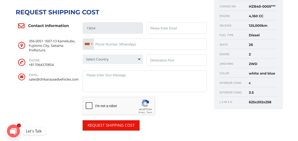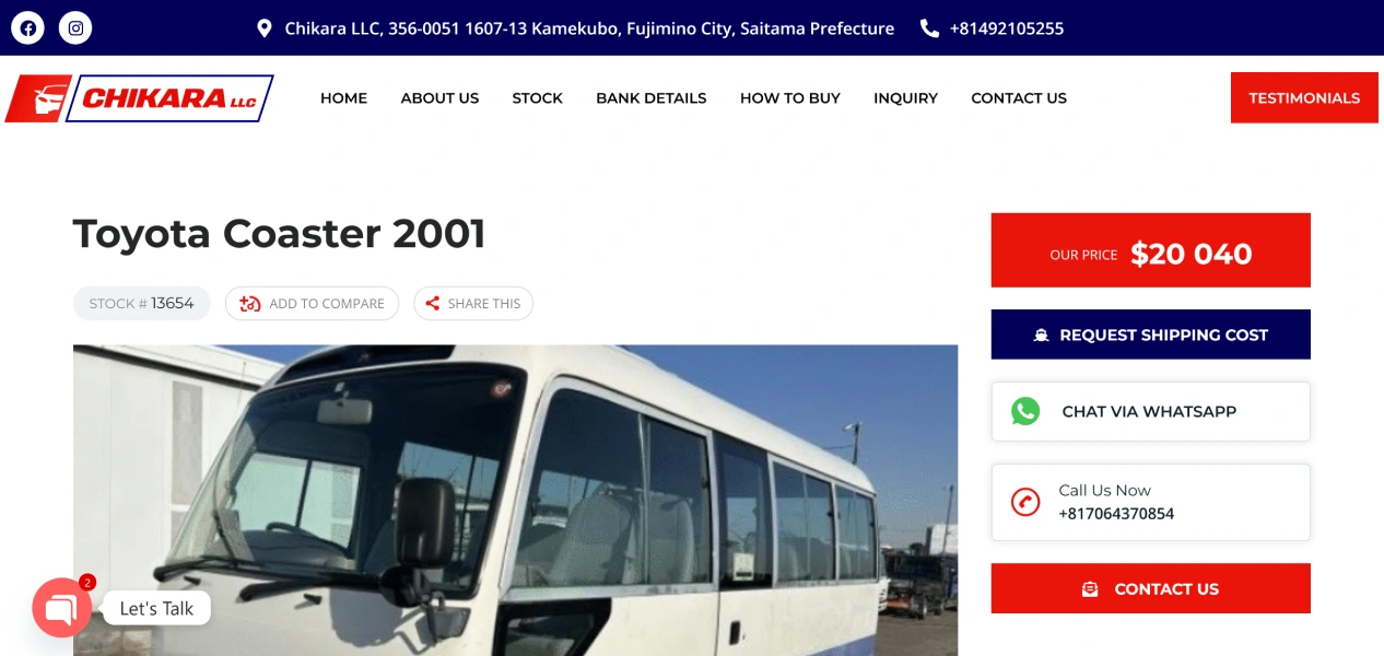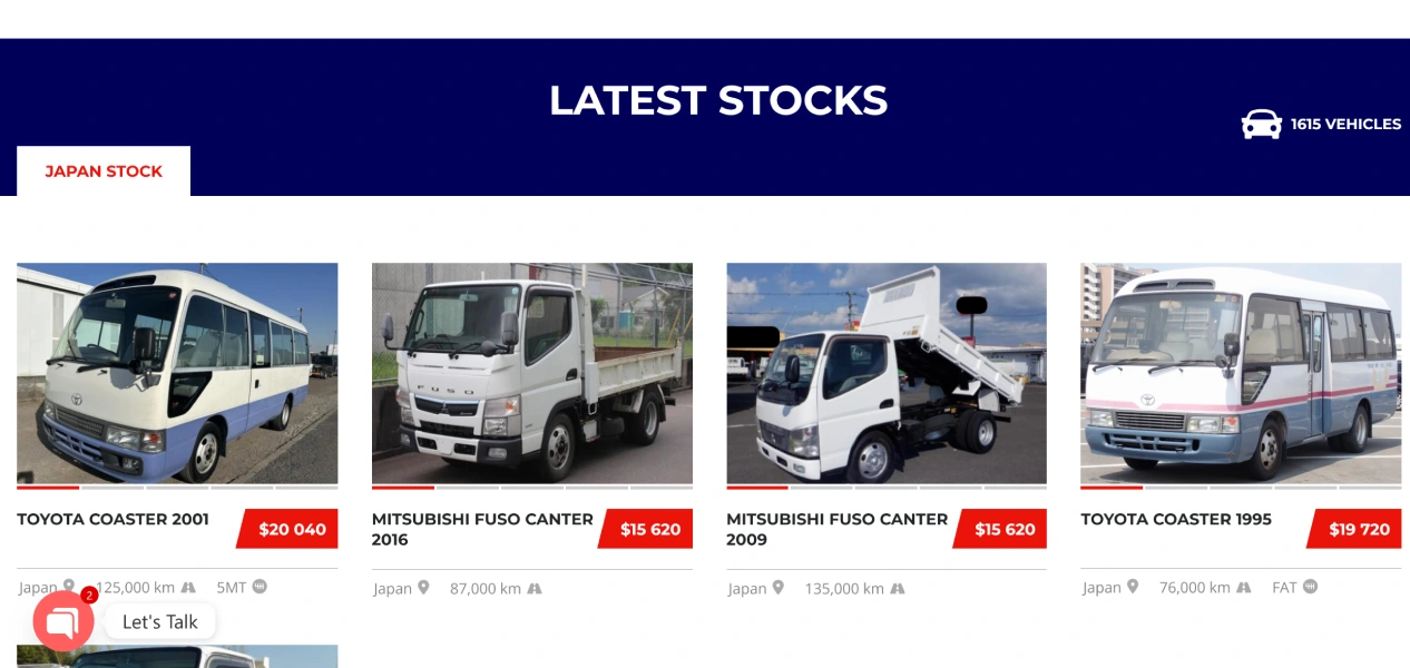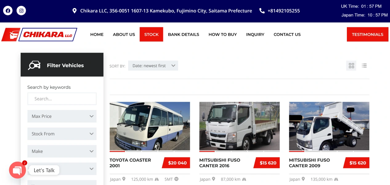 Chikara LLC operates in the used vehicle trading market, managing a continuously changing stock of vehicles for international buyers. The website was built to function not only as a public-facing vehicle listing platform but also as an internal tool for efficient stock control and updates, ensuring accuracy, speed, and ease of management.
